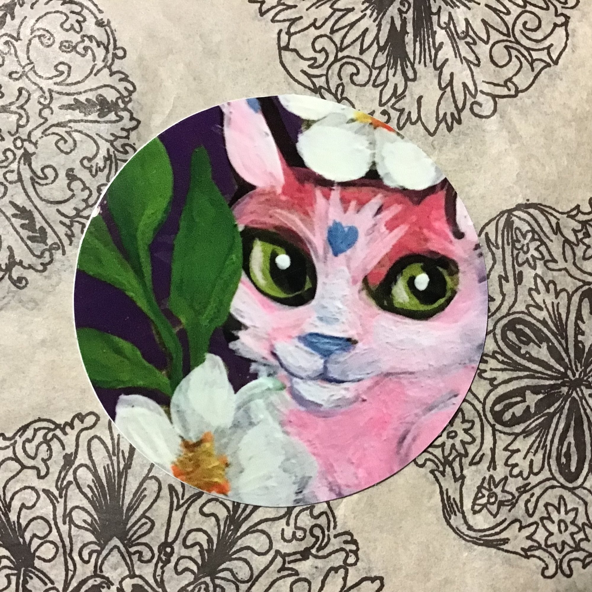 Pink Cat Sticker. Glossy finish. Round 2 1/2 inch.
